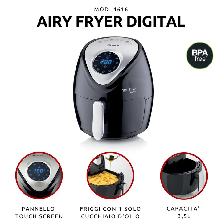 Airy Fryer Digital 4616, Heißluftfritteuse 3,5 Liter, 60-Minuten-Timer, LCD- und Touchscreen mit 7 Garstufen, Maximaltemperatur 200° C, 1300W, Schwarz